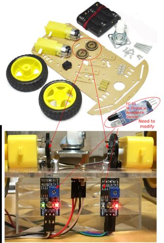 Amazonに中国製の安い2WD robot car kit を売っていたので、購入して見ました。 キットの中には回転センサー用の円盤も用意されており、それと以前に調べた 赤外線の障害物センサーを改造したものと組み合わせて回転センサー付きのものに して動作の状況を確…